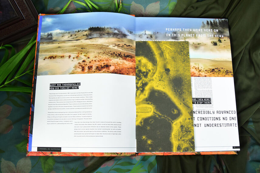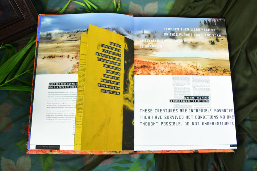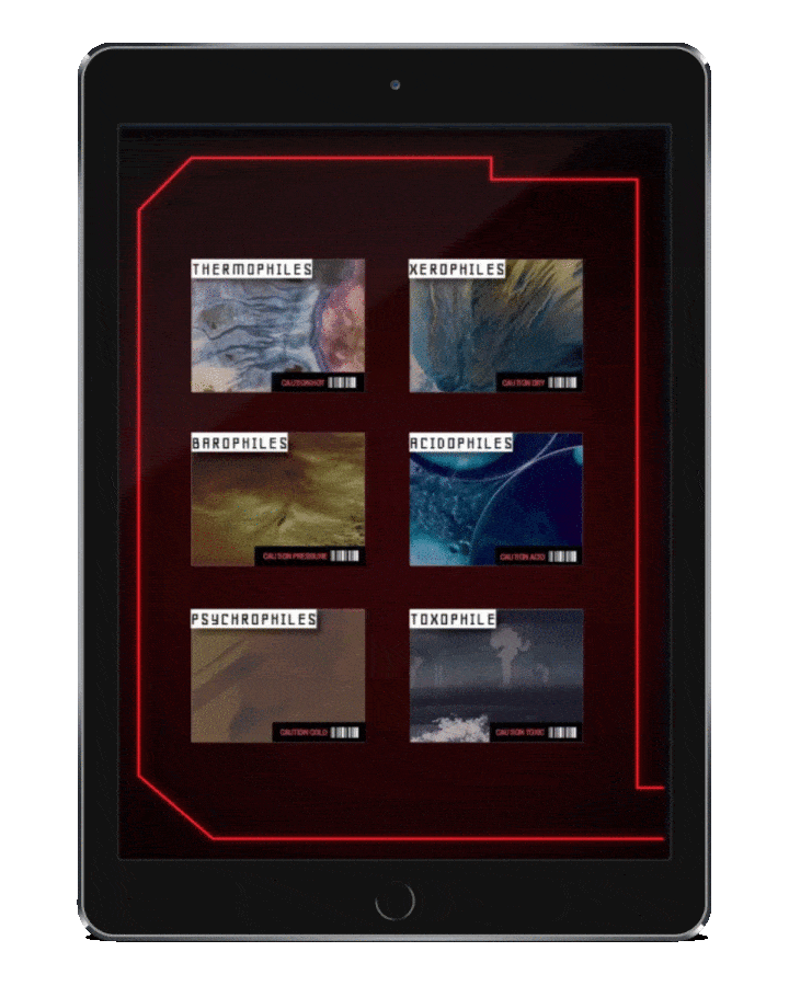 Exo-Files is a student project designing an interactive, multi-media learning experience. Exo-Files is an exploration app allowing users to interact and become spies to learn and explore the world of extremophiles. Extremophiles are microorganisms that can survive conditions that would kill most other life. The app covers 6 main types of extremophiles, and has secret sections that can be unlocked only if you buy the accompanying book and uncover the clues.